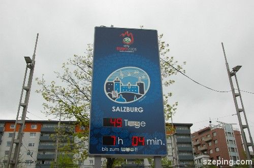 是的,奥地利与瑞士将在6月7日-29日协办欧洲杯足球赛。而 Salzburg 身为其中一个赛场(忘了说,上次去过的 Klagenfurt – Wörthersee 那边也是其中一个赛场)也就尽力带动那股热潮,设立了一个倒数指标来公告这足坛盛事的脚步已经越来越近了。