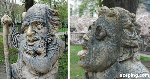 再绕去后面一点,通过一道桥后就到了一个有几尊矮人石像的“矮人公园”(Gartenzwerg)。