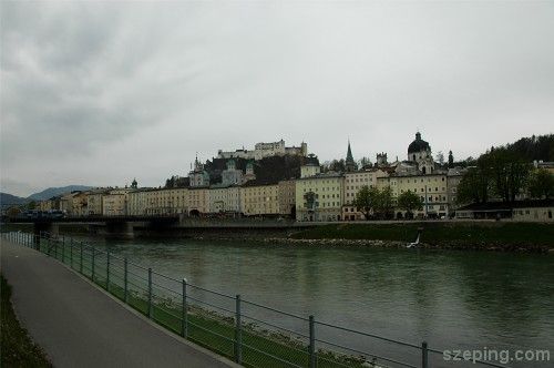 此河是老城和新城的界线 – 老城在对岸,远方 Mönchsberg 山上矗立着 Hohensalzburg 城堡。而新城本身则是被 Kapuzinerberg 山环绕着。